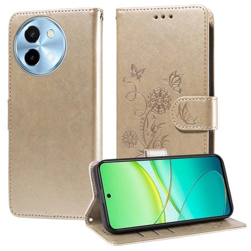 Funda de Cuero con Diseño de Mariposas y Flores En Relieve para Vivo Y38 5G / T3X 5G (Dorada)