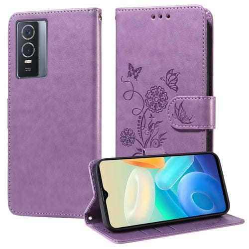Funda de Cuero con Diseño de Mariposas y Flores En Relieve para Vivo Y76 5G/Y76S (Morado)