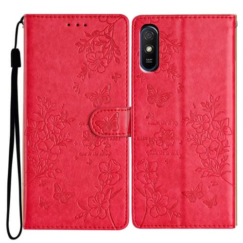 Funda de Cuero con Diseño de Mariposas y Flores para Redmi 9A (Rojo)