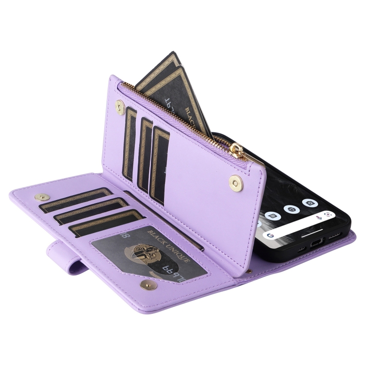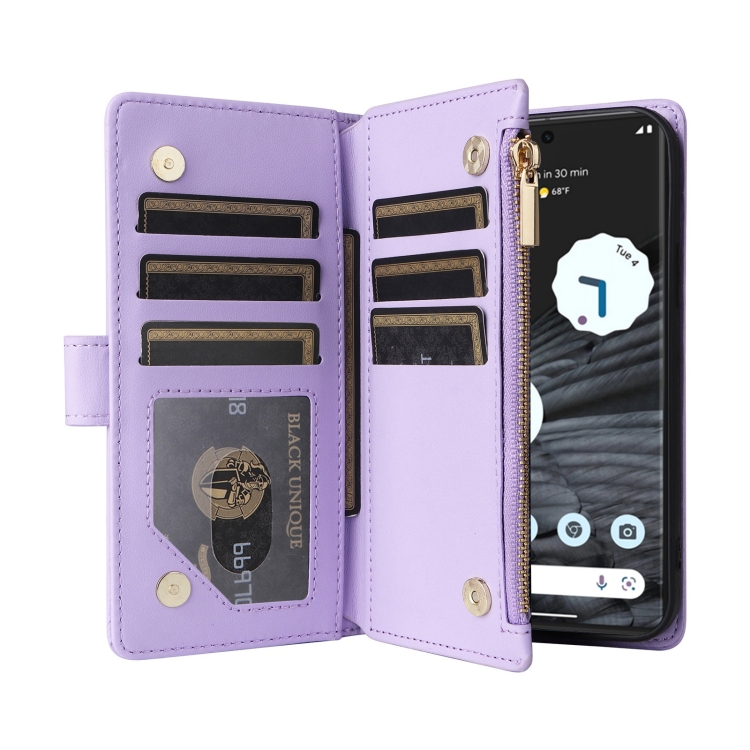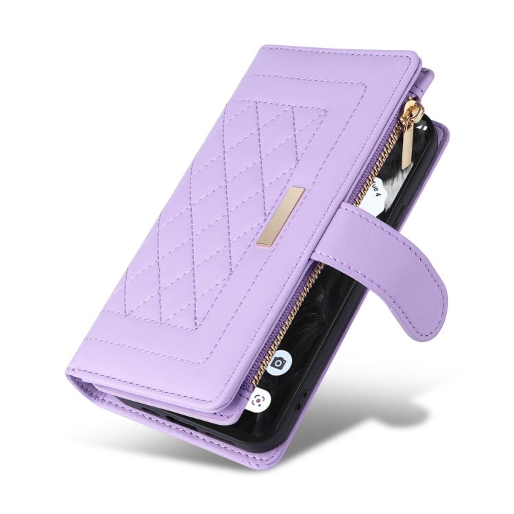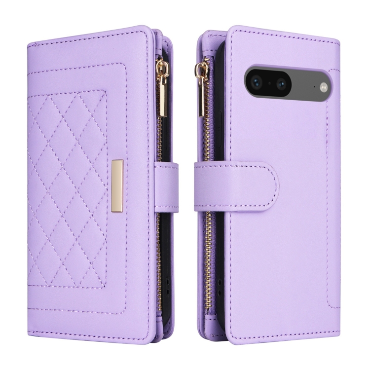 Funda de Cuero con Diseño de Rombos y Billetera Cruzada con Cremallera para Google Pixel 7 (Morado)