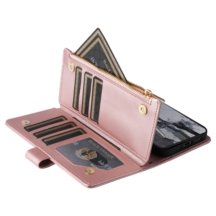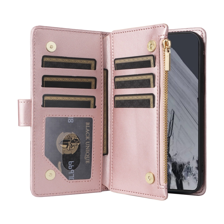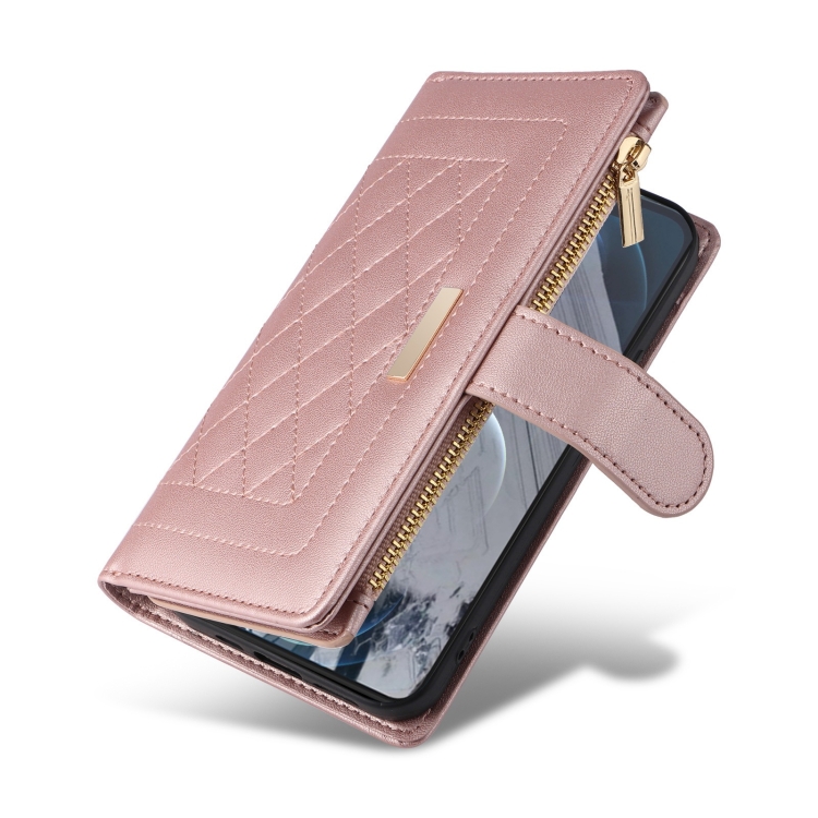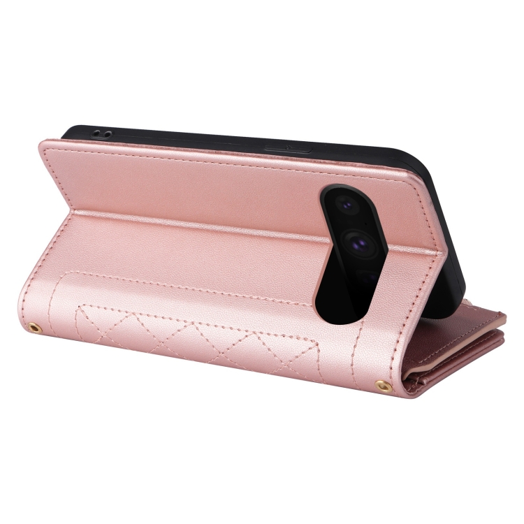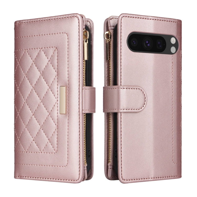 Funda de Cuero Google Pixel 8 Pro con Diseño de Rombos y Billetera Cruzada con Cremallera (Oro Rosa)