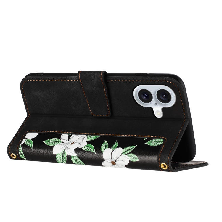 Funda de Cuero para iPhone 16 Plus con Estampado Floral y Cordón (Negro)