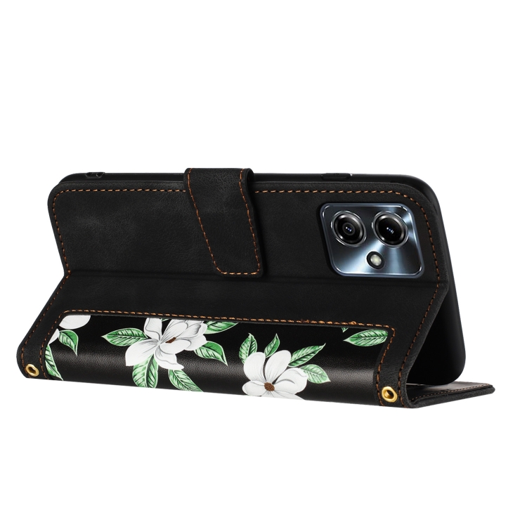Funda de Cuero con Estampado Floral y Cordón para Motorola Moto G14 (Negro)