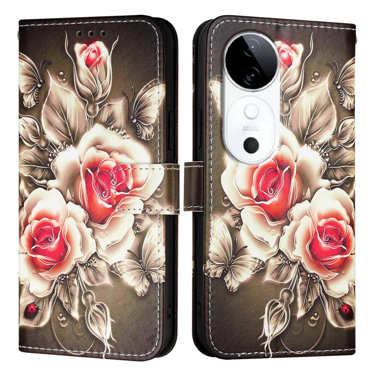 Funda de Cuero con Patrón de Dibujo En Color Liso para Teléfono Vivo S19 (Rosas Sobre Negro)