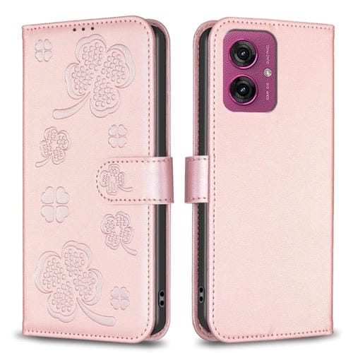 Funda de Cuero con Relieve de Cuatro Hojas para Motorola Moto G55 (Rosa)