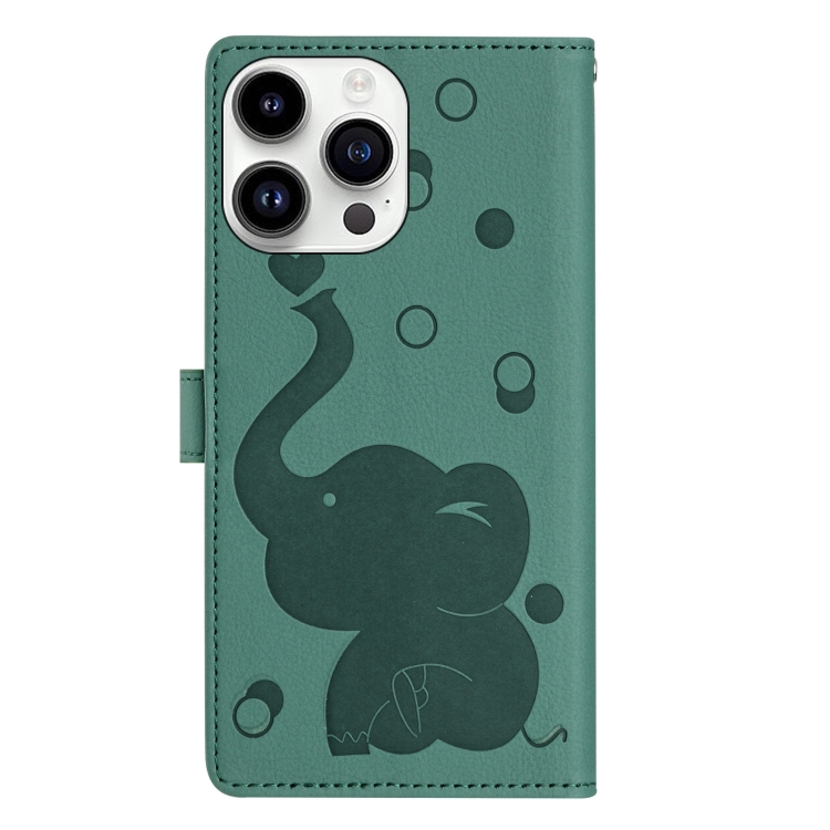 Funda de Cuero iPhone 16 Pro Relieve Elefante Dibujos Animados (Verde)