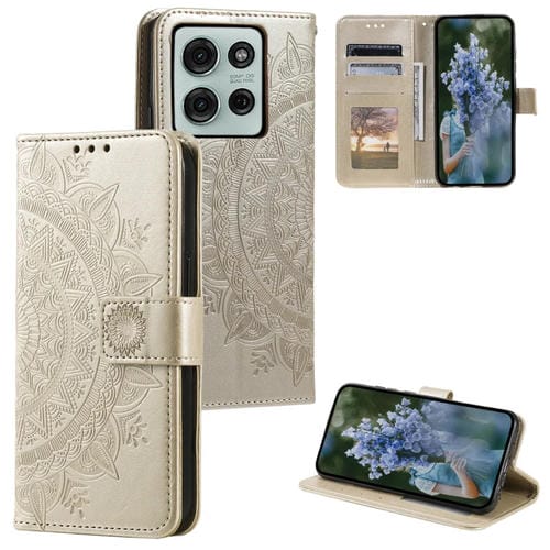 Funda de Cuero Motorola Moto G75 5G con Relieve de Flores y Tótem con Cordón (Dorado)