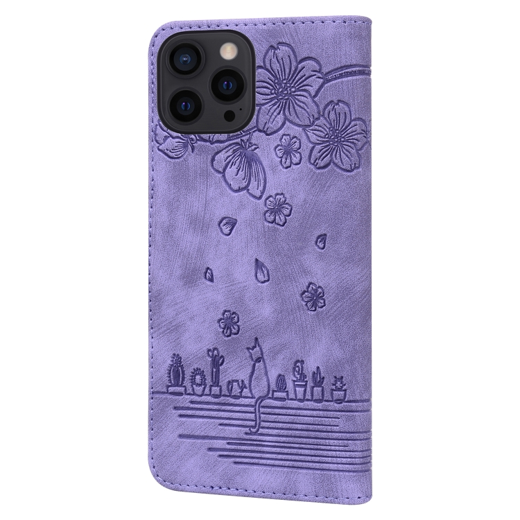 Funda de Cuero con Relieve de Gato Sakura Dibujos Animados para iPhone 16 Pro Max (Morado)