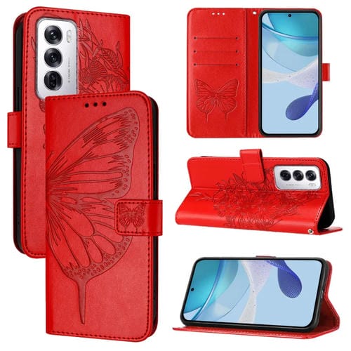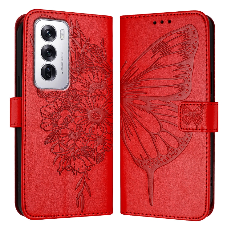 Funda de Cuero con Relieve de Mariposa para Teléfono Oppo Reno12 5G Global (Rojo)