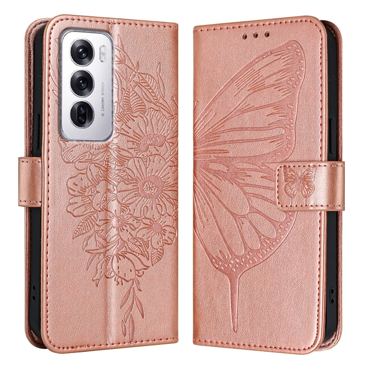 Funda de Cuero con Relieve de Mariposa para Teléfono Oppo Reno12 5G (Oro Rosa)