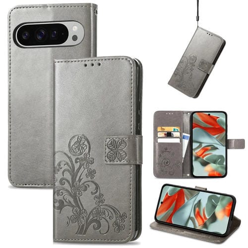 Funda de Cuero con Relieve y Cierre de Cuatro Hojas para Google Pixel 9 Pro XL (Gris)