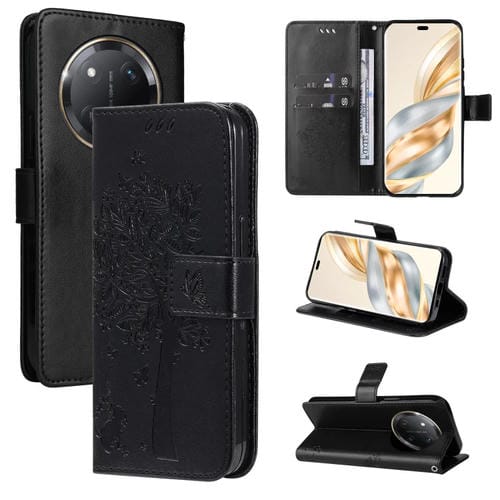 Funda de Cuero con Tapa y Diseño Árbol y Gato en Relieve para Honor X9C 5G (Negro)