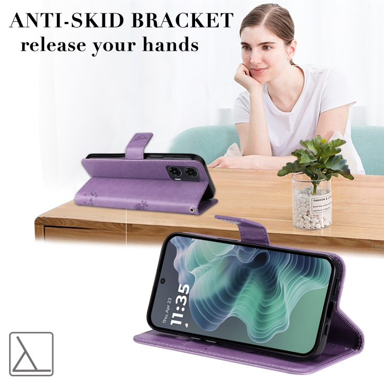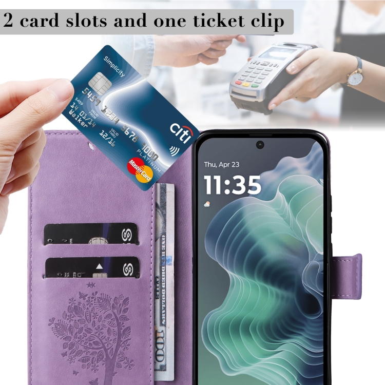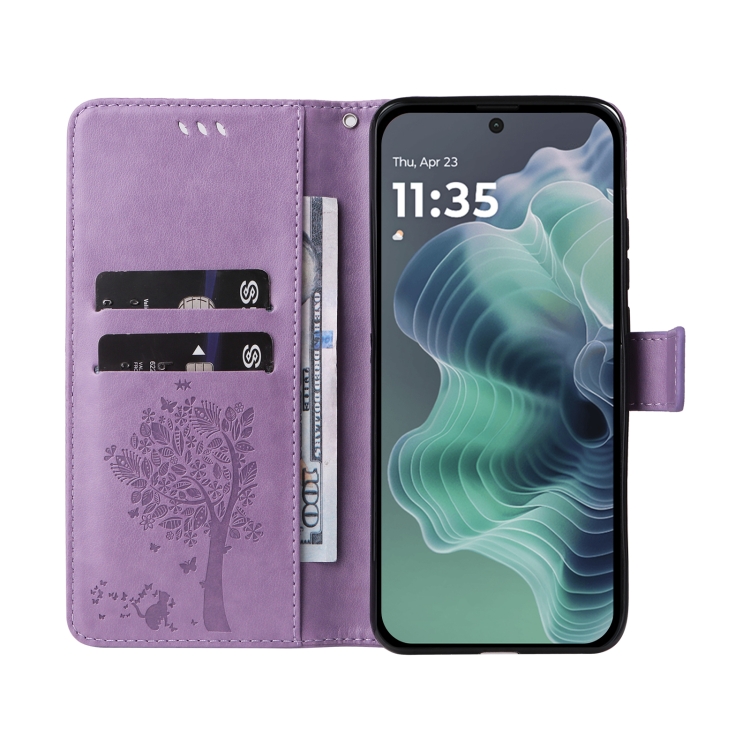 Funda de Cuero con Tapa para Motorola Moto G35 con Diseño de Árbol y Gato (Morado Claro)