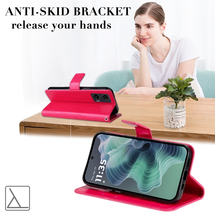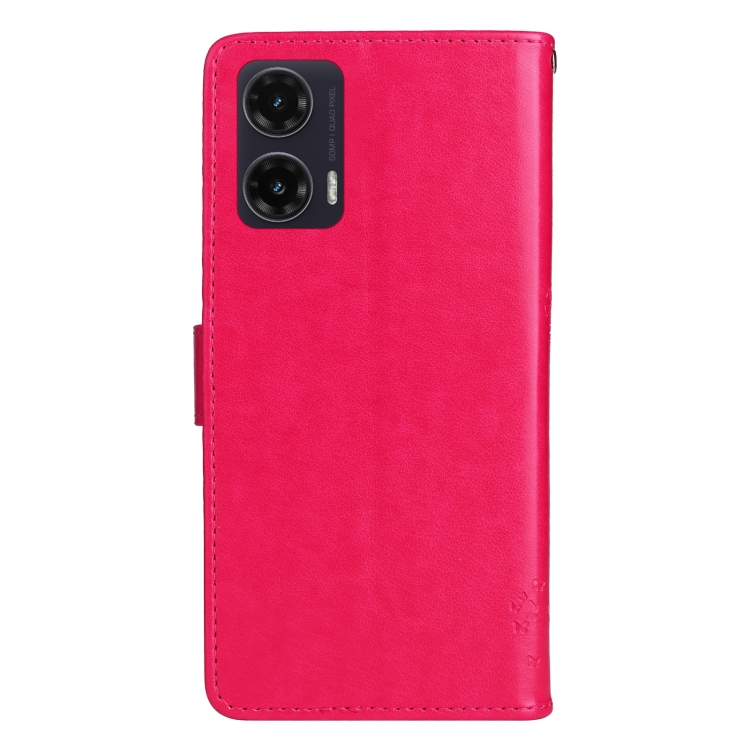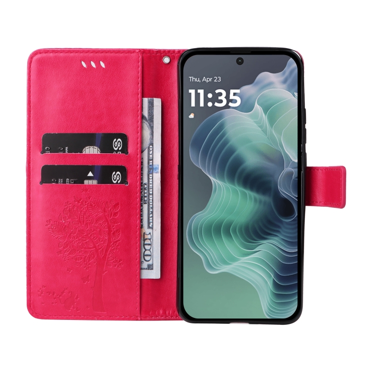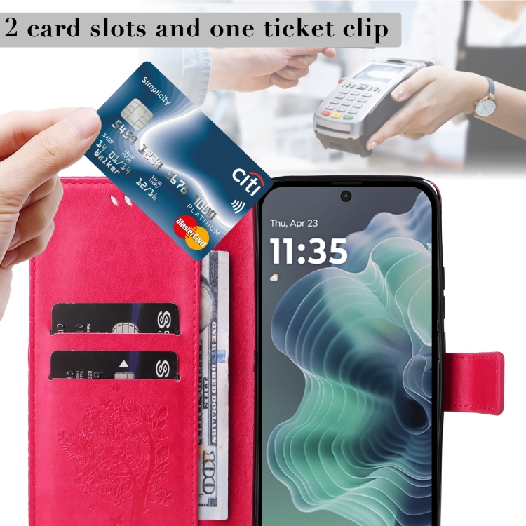 Funda de Cuero con Tapa para Motorola Moto G35 con Diseño Árbol y Gato en Relieve (Rosa Rojo)