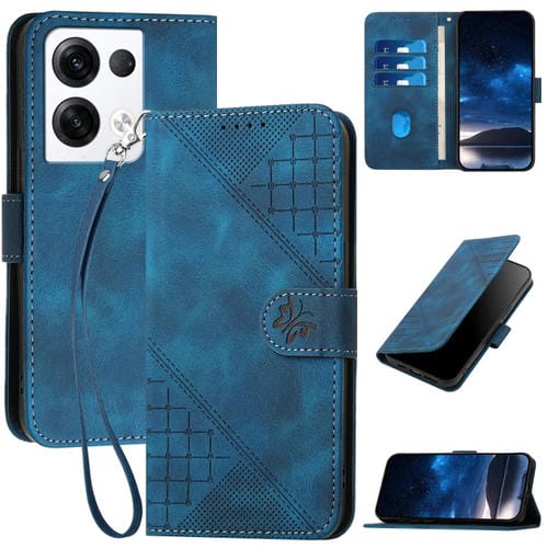 Funda de Cuero con Tapa para Teléfono Oppo Reno8 Pro 5G Global Yx0080 con Diseño En Relieve de Mariposa y Cuadrícula y Cordón (Azul Oscuro)