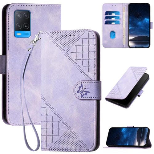 Funda de Cuero con Tapa y Cordón para Oppo A93 5G Yx0080 con Diseño En Relieve de Mariposa y Cuadrícula (Morado Claro)