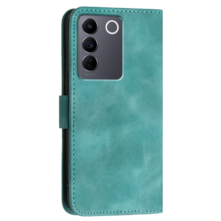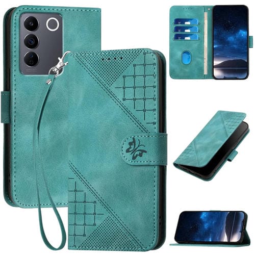 Funda de Cuero con Tapa y Cordón para Vivo V27E 4G Global Yx0080 con Diseño En Relieve de Mariposa y Cuadrícula (Azul Claro)