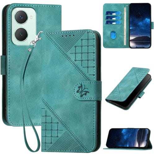 Funda de Cuero con Tapa y Cordón para Vivo Y03 4G Global Yx0080 con Diseño En Relieve de Mariposa y Cuadrícula (Azul Claro)