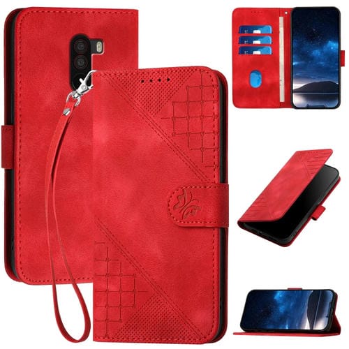 Funda de Cuero con Tapa y Cordón para Xiaomi Pocophone F1 Yx0080 con Diseño En Relieve de Mariposas y Cuadrícula (Rojo)