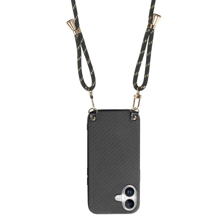 Funda de Cuero para iPhone 16 con Textura de Fibra de Carbono y Correa Cruzada (Negro)