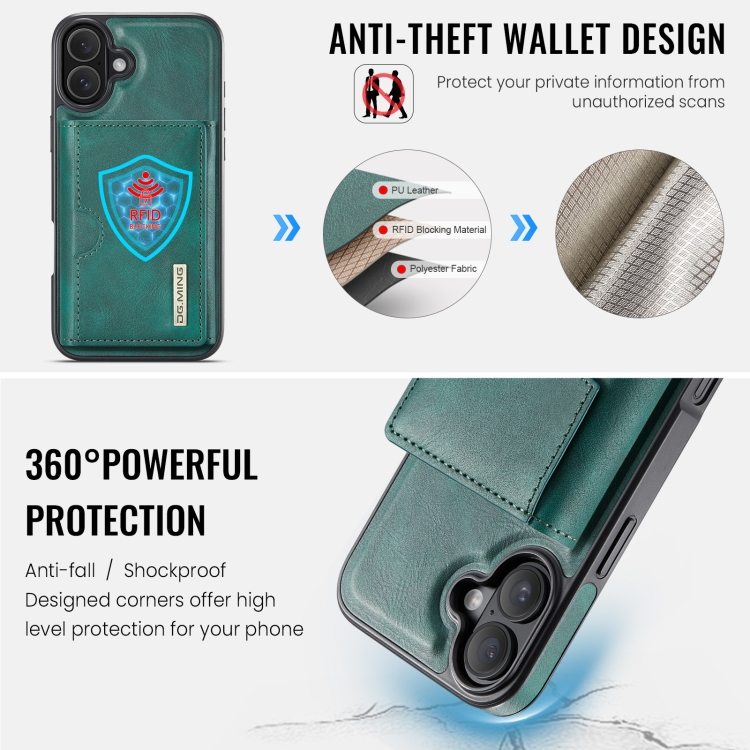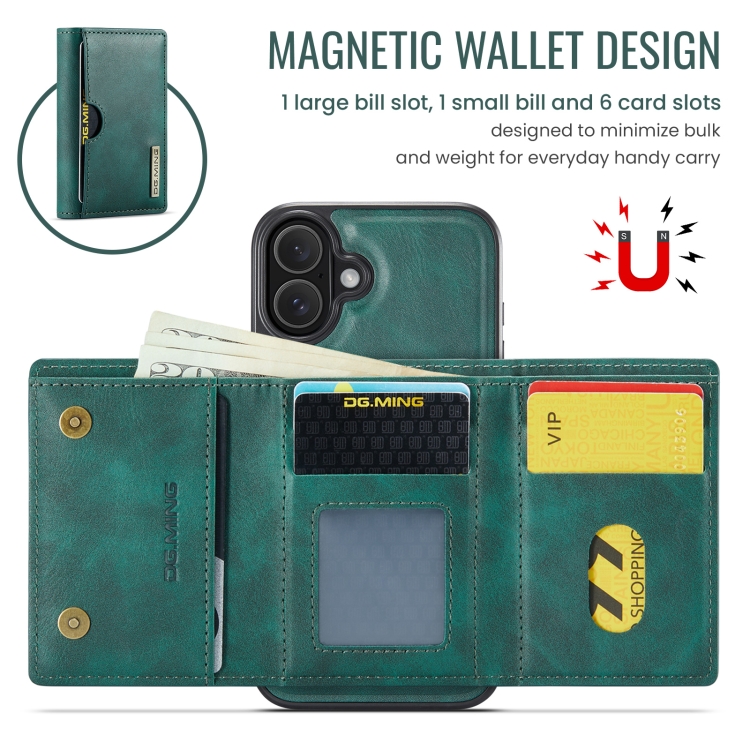 Funda de Cuero Extraíble para iPhone 16 Plus Dg.Ming M6 con Tarjetero Rfid Tres Pliegues (Verde)