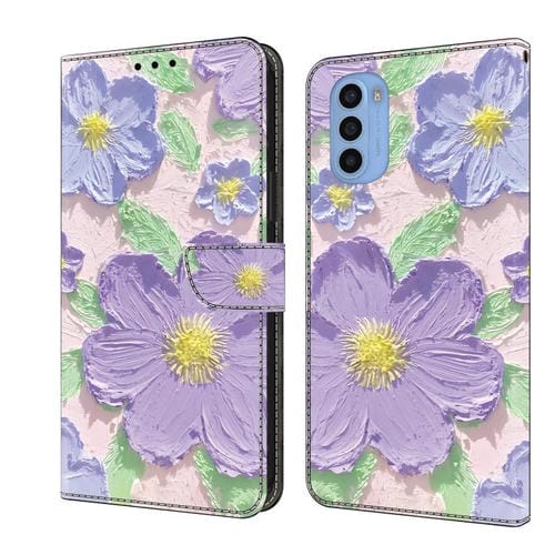 Funda de Cuero Pintada a Mano Motorola Moto G31 con Pintura al Óleo Flores Moradas