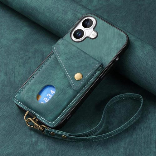 Funda de cuero plegable estilo billetera retro para iPhone 17 con correa (verde)