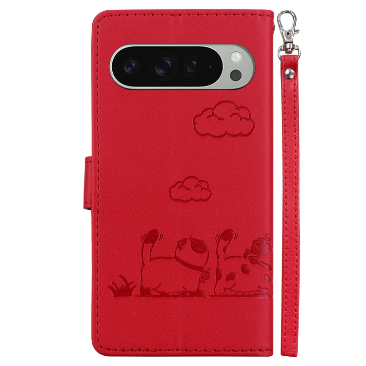 Funda de Cuero Rfid para Google Pixel 9 y 9 Pro con Diseño de Gatos (Roja)