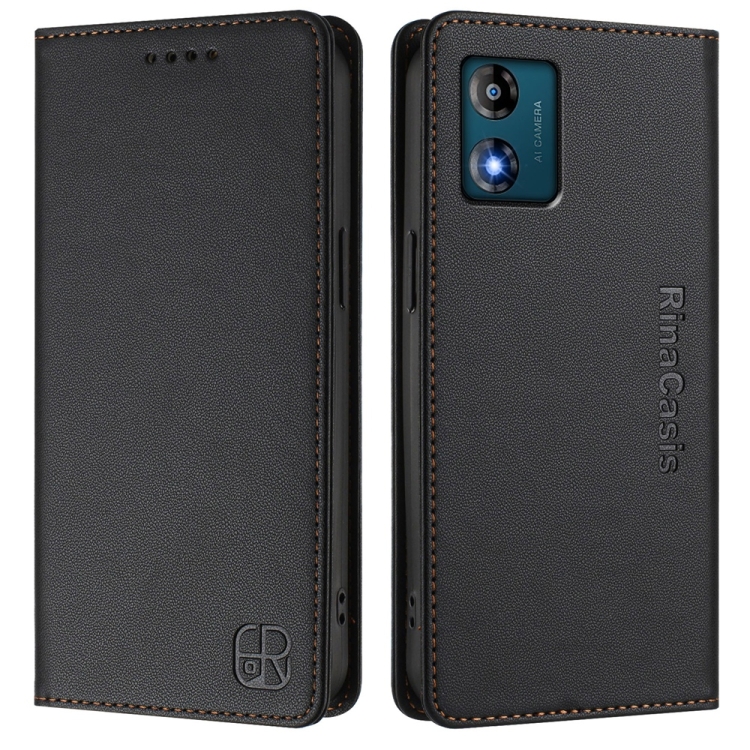Funda de Cuero Rfid con Doble Pliegue y Succión Magnética para Motorola Moto E13 Rc01 (Negro)