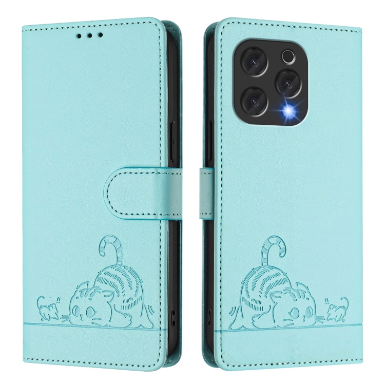 Funda de Cuero Rfid para Doogee N55 Plus con Estampado de Rata y Gato y Cordón (Verde Menta)