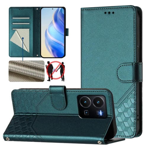 Funda de Cuero Rfid con Relieve de Panal Global para Vivo Y35 4G / Y22S 4G / Y22 4G (Verde Pavo Real)