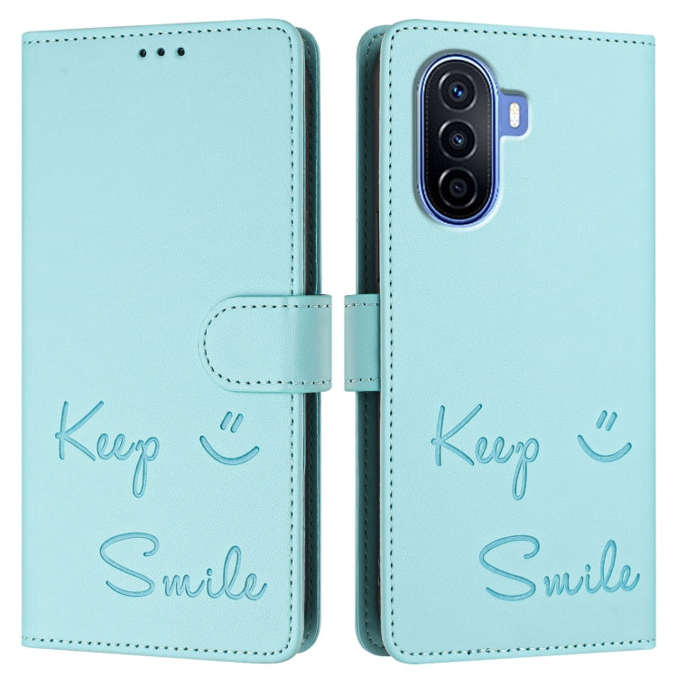 Funda de Cuero Rfid con Relieve Sonriente para Huawei Enjoy 50 4G (Verde Menta)