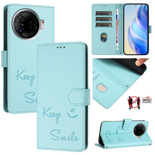 Funda de Cuero Rfid con Relieve Sonriente para Tecno Camon 30 Pro 5G (Verde Menta)