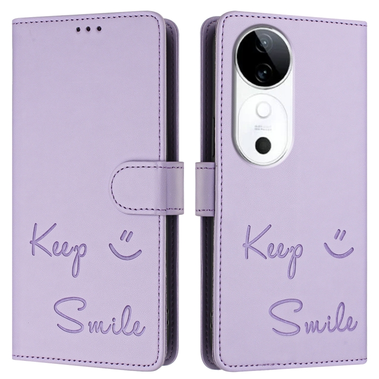 Funda de Cuero Rfid con Relieve Sonriente para Teléfono Vivo S19 (Morado Claro)