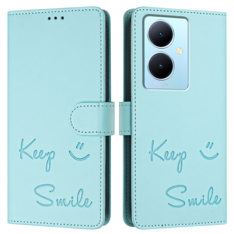 Funda de Cuero Rfid con Relieve Sonriente para Vivo Y78 5G Global / V29 Lite (Verde Menta)