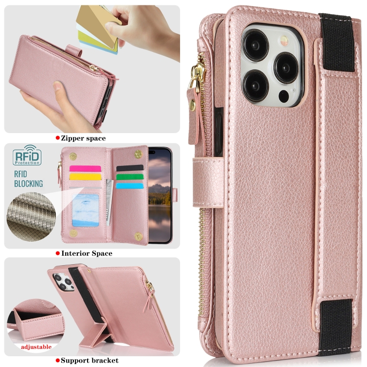 Funda de Cuero Rfid para iPhone 16 Pro con Cierre de Cremallera y Correa para la Muñeca (Oro Rosa)
