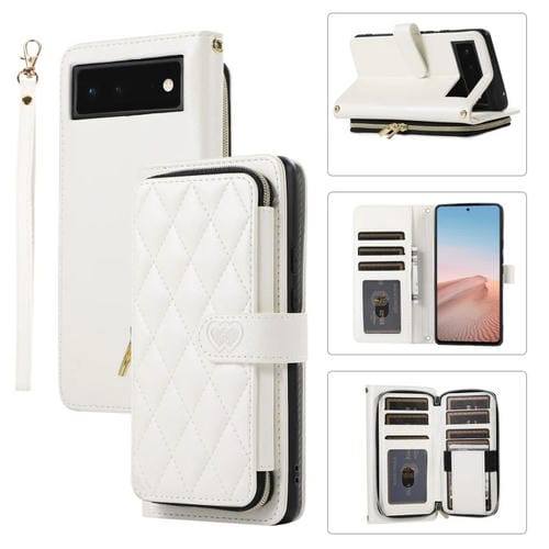 Funda de Cuero Tipo Billetera con Cremallera Completa y Diseño Romboidal para Google Pixel 6 (Blanca)