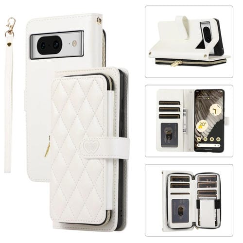 Funda de Cuero Tipo Billetera con Cremallera y Diseño Romboidal para Google Pixel 8A (Blanca)