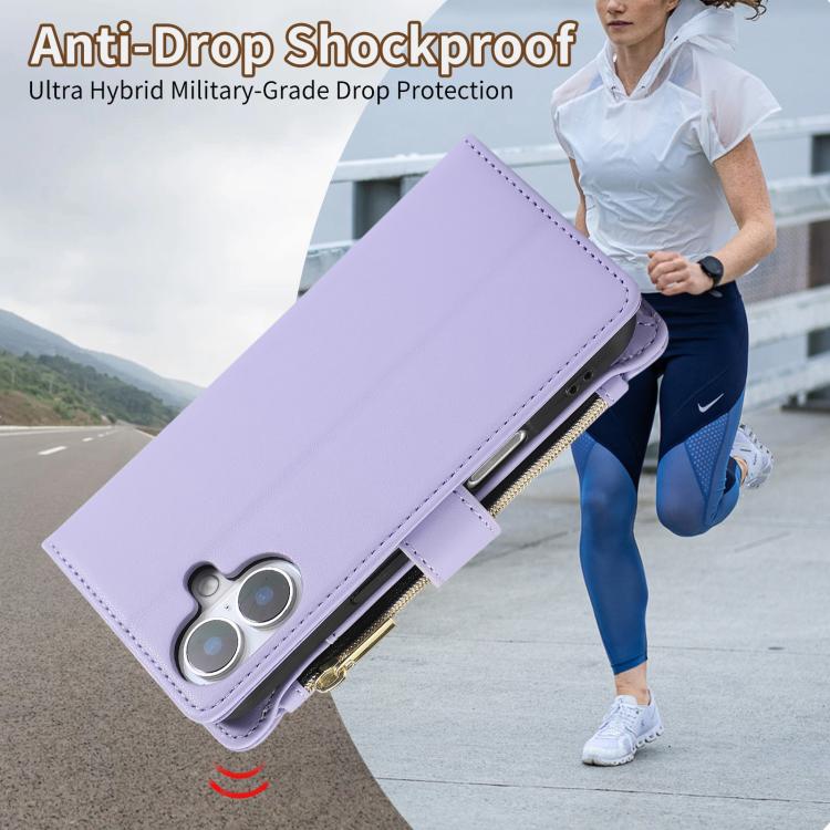 Funda de Cuero Tipo Billetera con Cremallera y Diseño Rombal para iPhone 16 Plus (Morado)