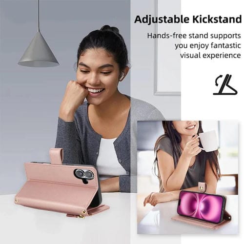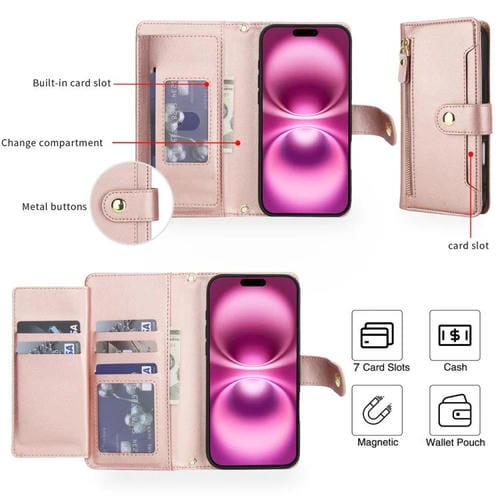 Funda de cuero tipo billetera con cremallera y siete ranuras para tarjetas para iPhone 17 (oro rosa)