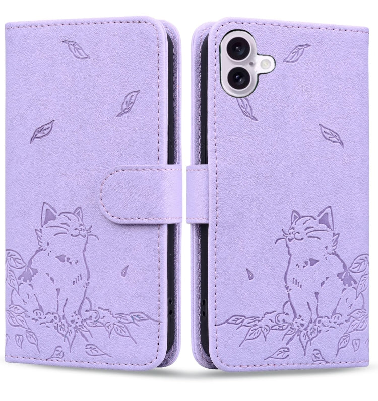 Funda de Piel para iPhone 16 Estampado de Gato (Morado)