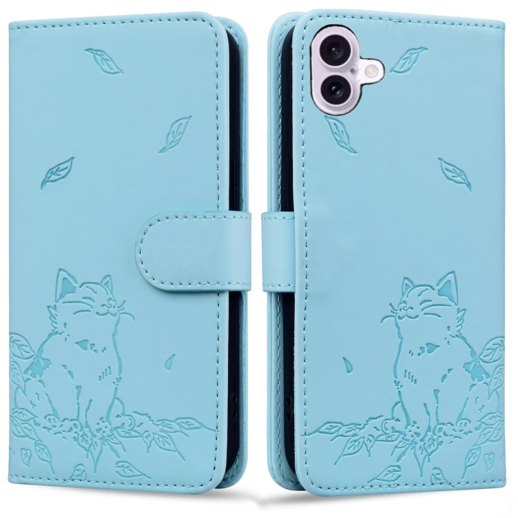 Funda de Piel para iPhone 16 Plus Estampado de Gato (Azul Cielo)