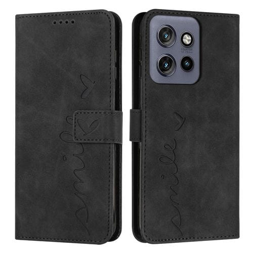Funda de Piel con Relieve de Corazón para Motorola Edge 50 Neo con Cordón Largo (Negro)