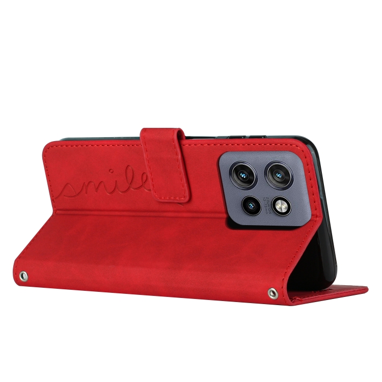 Funda de Piel con Relieve de Corazón para Motorola Edge 50 Neo con Cordón Largo (Rojo)