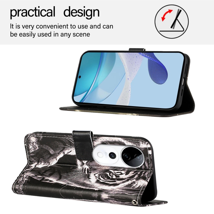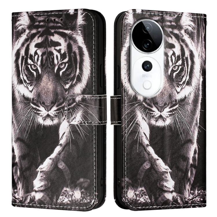 Funda de Teléfono de Cuero con Tejido Liso y Estampado de Dibujos En Color para Vivo S19 Pro (Tigre Blanco y Negro)