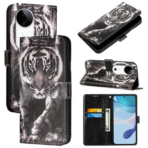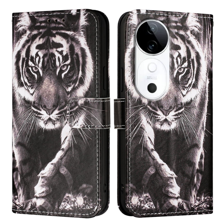 Funda de Teléfono de Cuero con Tejido Liso y Patrón de Dibujo En Color para Vivo S19 (Tigre Blanco y Negro)