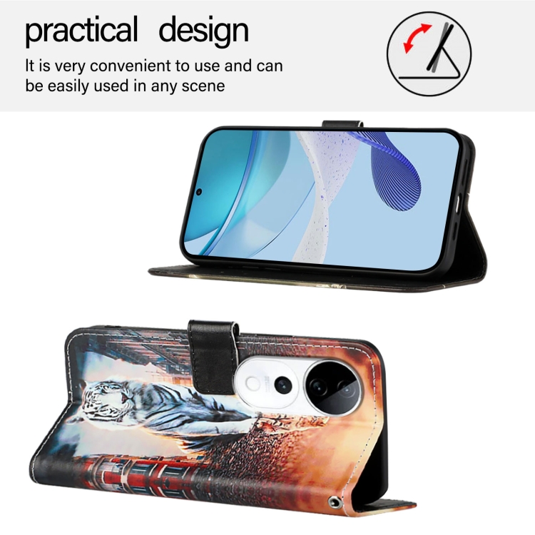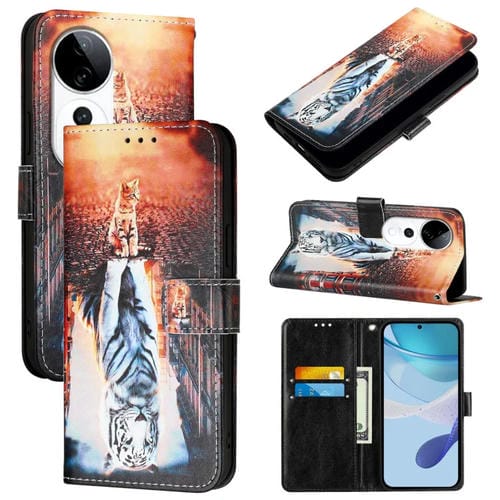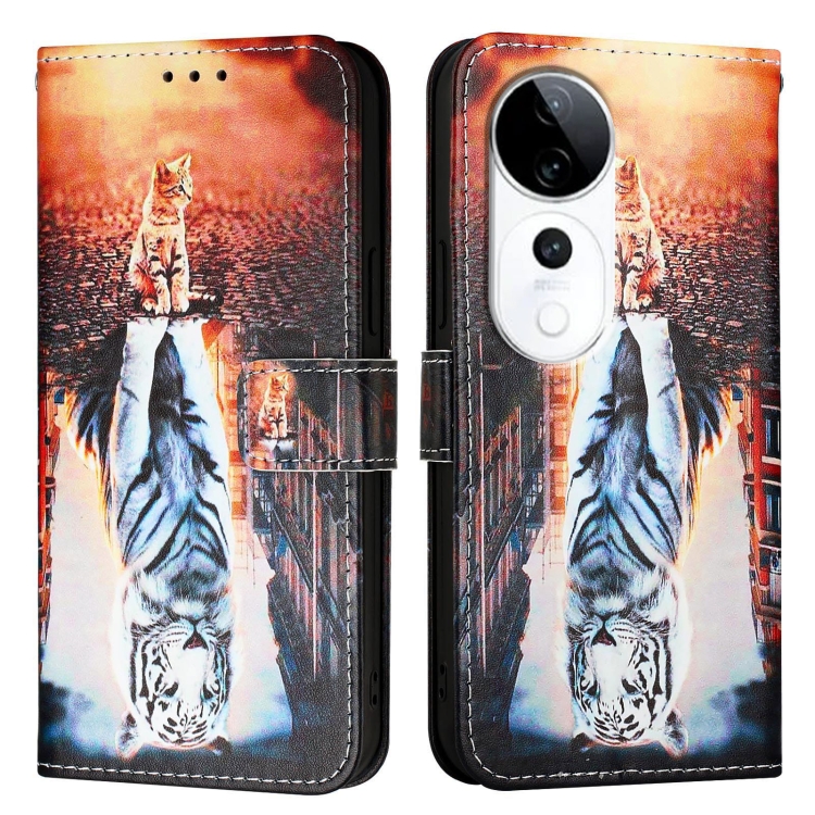 Funda de Teléfono de Cuero de Tejido Liso con Patrón de Dibujo de Colores para Vivo S19 Pro (Gatos y Tigres)