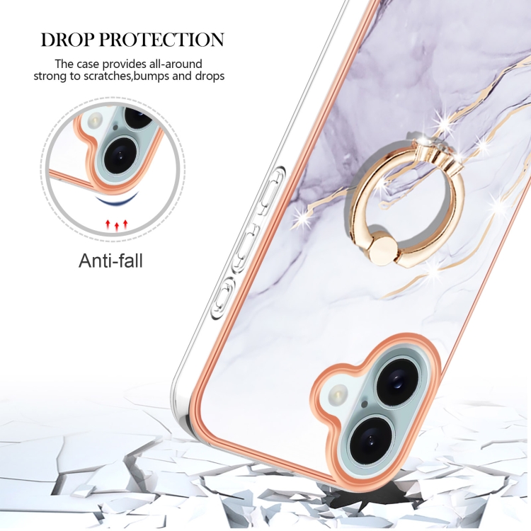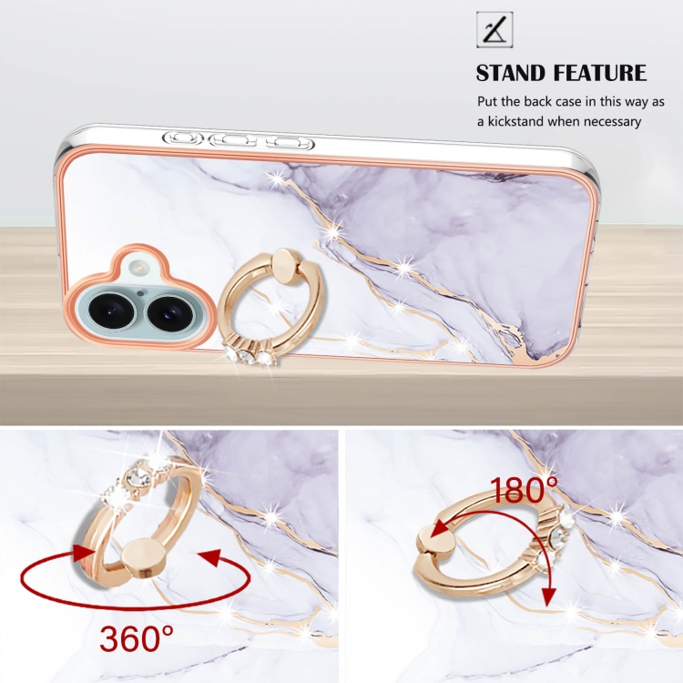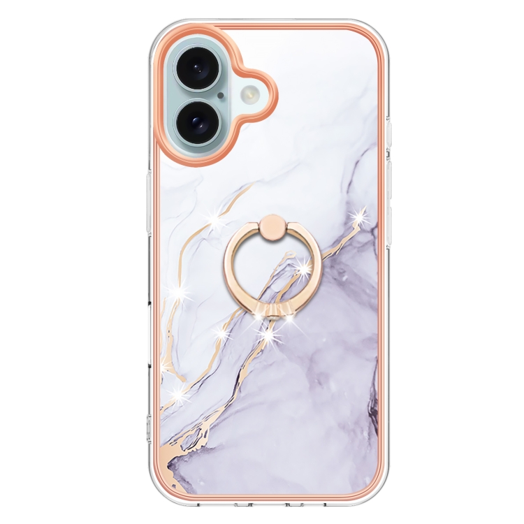 Funda para iPhone 16 con Soporte para Anillo y Revestimiento Mármol Imd TPU (Blanco)