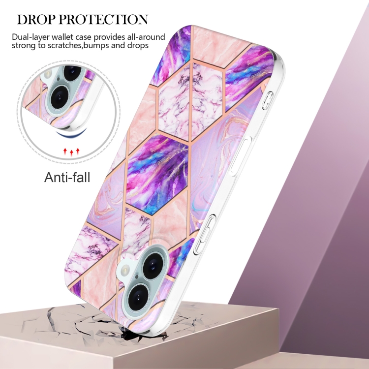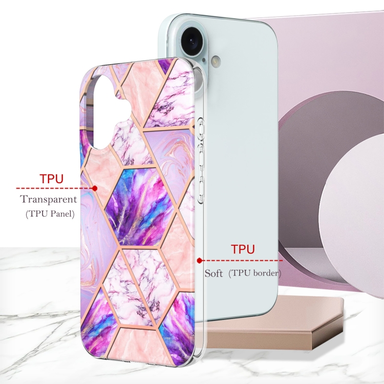 Funda para iPhone 16 Plus Diseño Flores Mármol Empalme Galvanizado Doble Cara Imd TPU (Morado Claro)