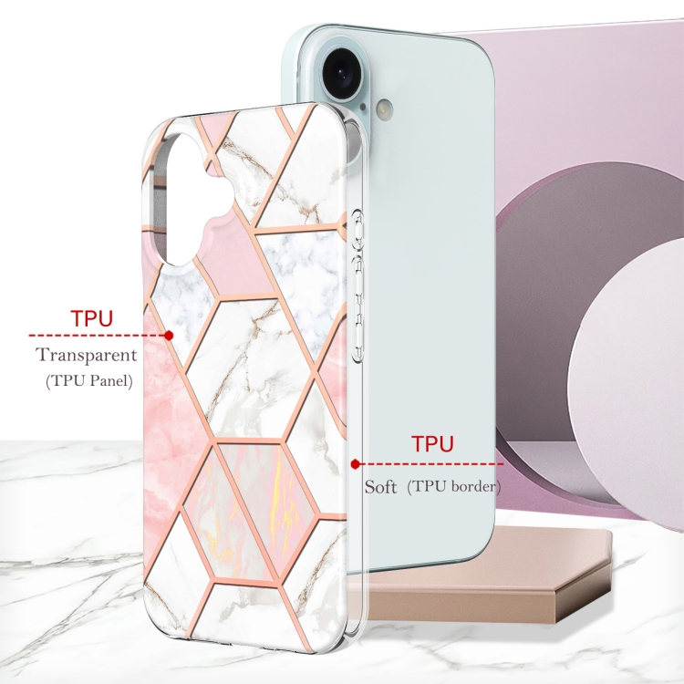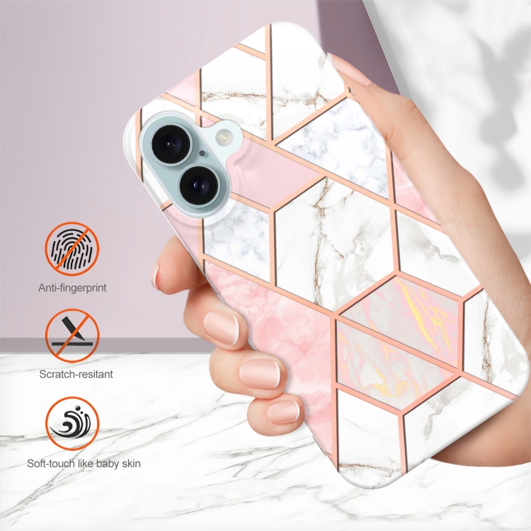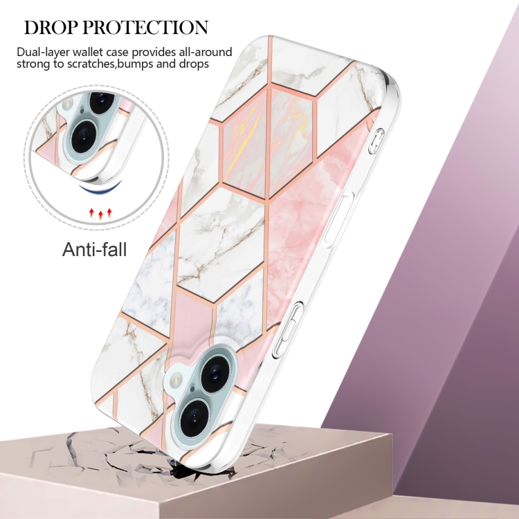 Funda para iPhone 16 Plus Diseño Flores Mármol Empalme Galvanizado Doble Cara Imd TPU (Rosa y Blanco)